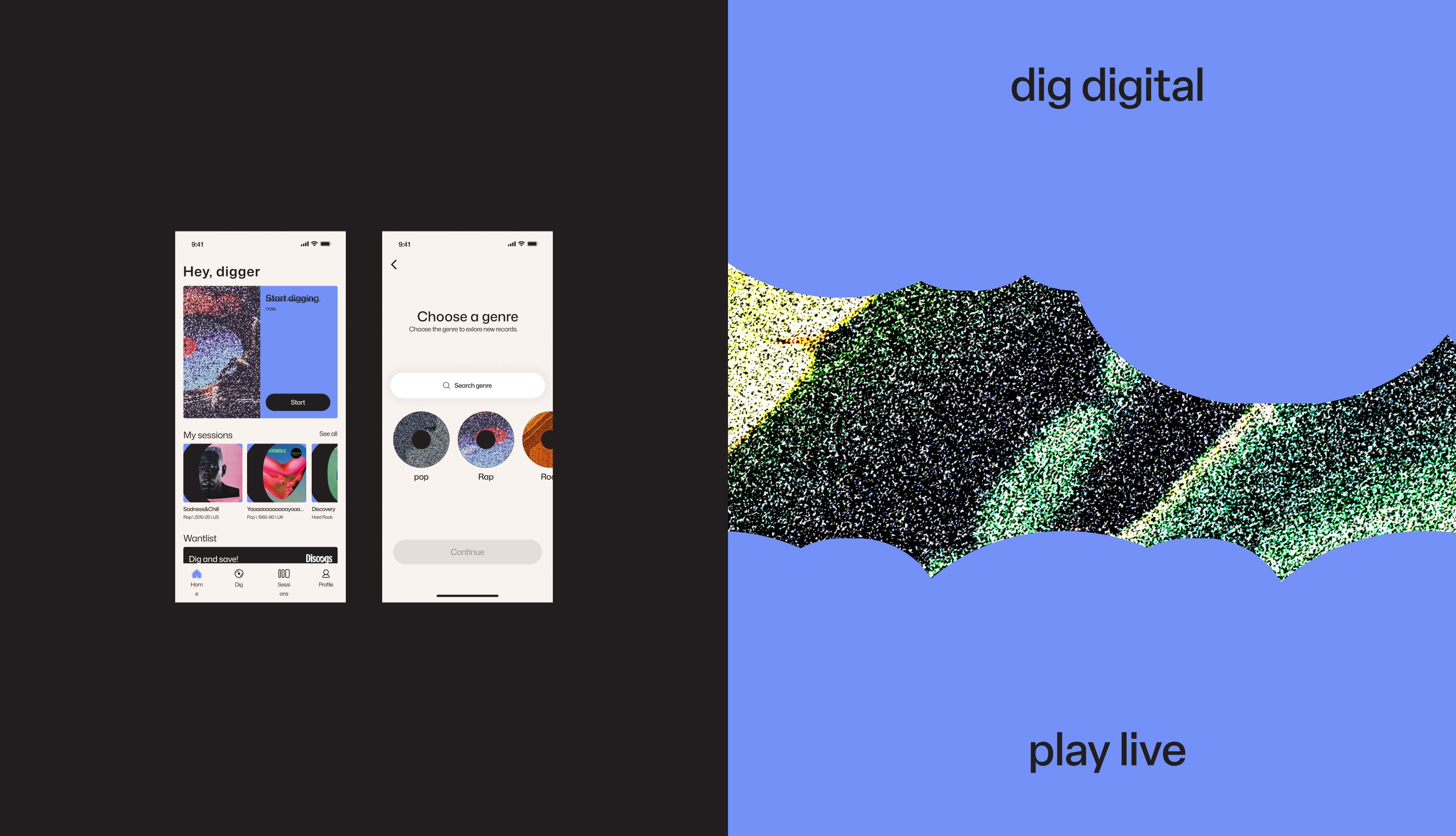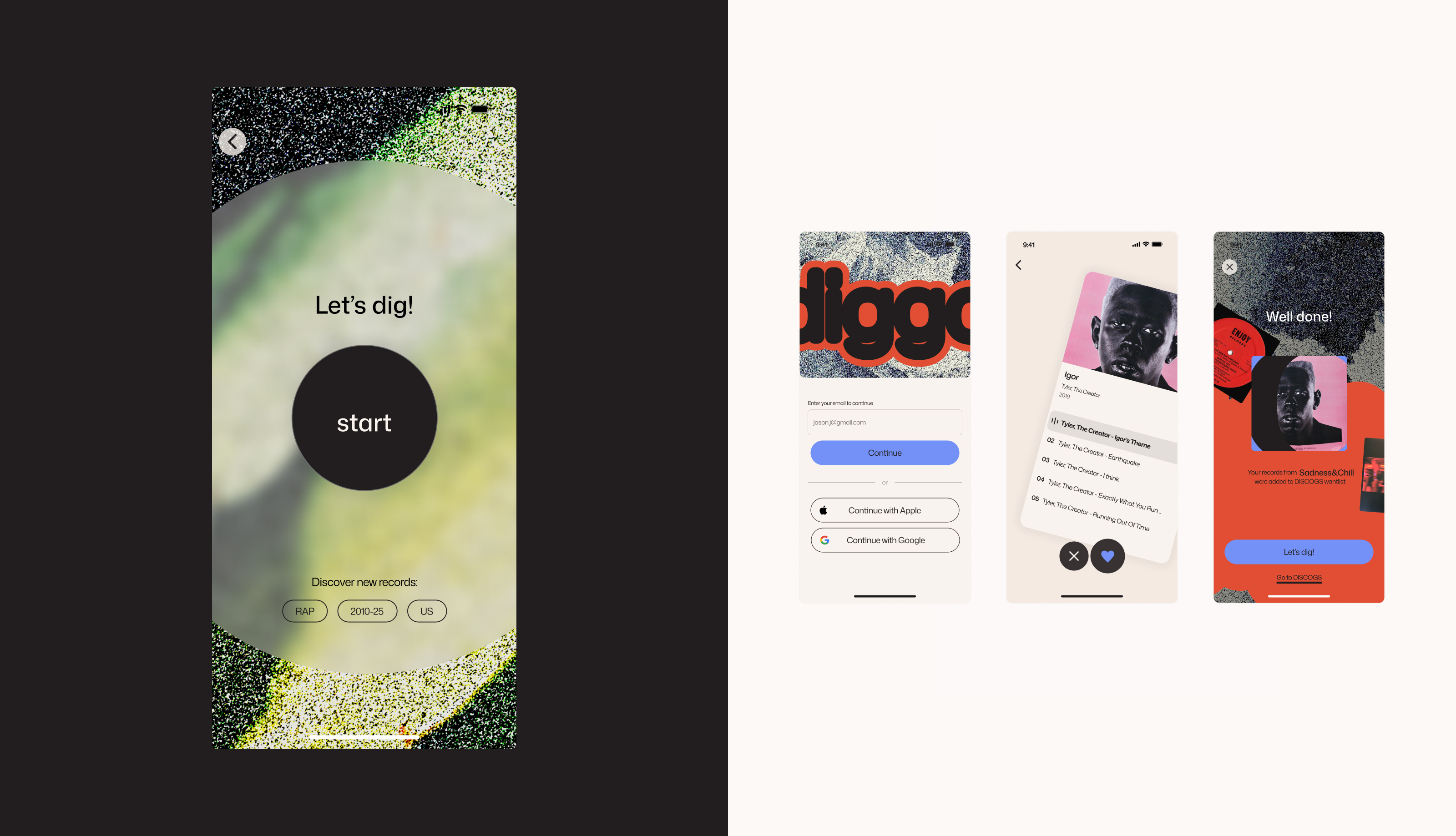 Diggo is a mobile application dedicated to discovering and exploring vinyl music. For the founders of Diggo, I designed the app end-to-end, leading UX design, UI testing, and the visual direction of the overall communication.